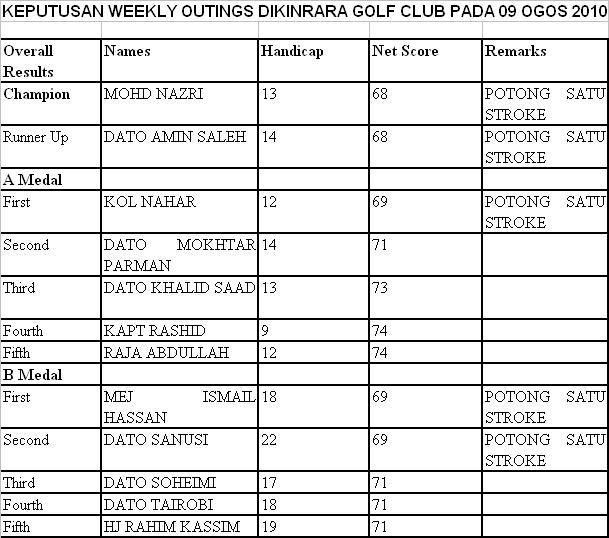 Nampaknya banyak members yang turuti permainan diKinrara Golf Club pada 09 Ogos 2010. Perbezaan nya ialah permainan kita diadakan pada hari Isnin dan bukan pada hari Rabu saperti lazim nya. Sebabnya pada hari Rabu dijangka kita akan menyambut bulan Ramadhan dan memulakan ibadah Berpuasa. Saya tak dapat menyertai sebab ‘urusan domestik’. Tak boleh dielakkan. Sorry.